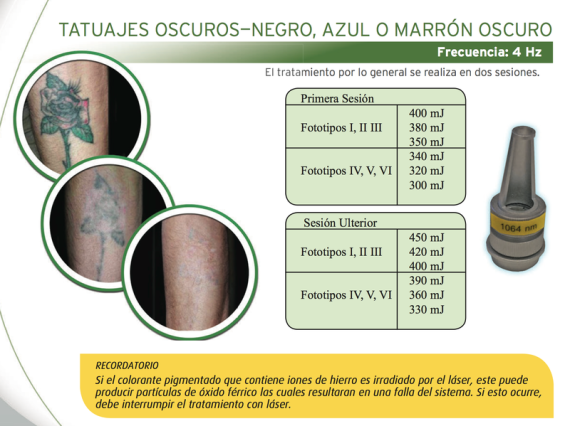 Según diferentes estudios, los láseres Q-Switched de Alejandrita y Rubí se utilizan para eliminar tatuajes de color negro y azules, aunque con limitaciones en los fototipos de piel IV – V y alto riesgo de quemadura epidérmica.