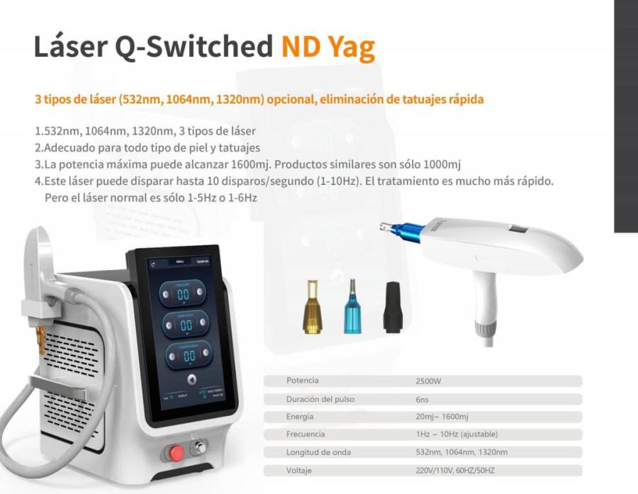 Es un láser medico de Nd:Yag Q-Switched con una longitud de onda de 1064nm ideal para la eliminación de tinta negra en la piel. Además cuenta con un filtro KTP para afectar a un rango más extenso de colores, pudiendo eliminar hasta colores rojos, azules y marrones, dependiendo de su grado de intensidad.